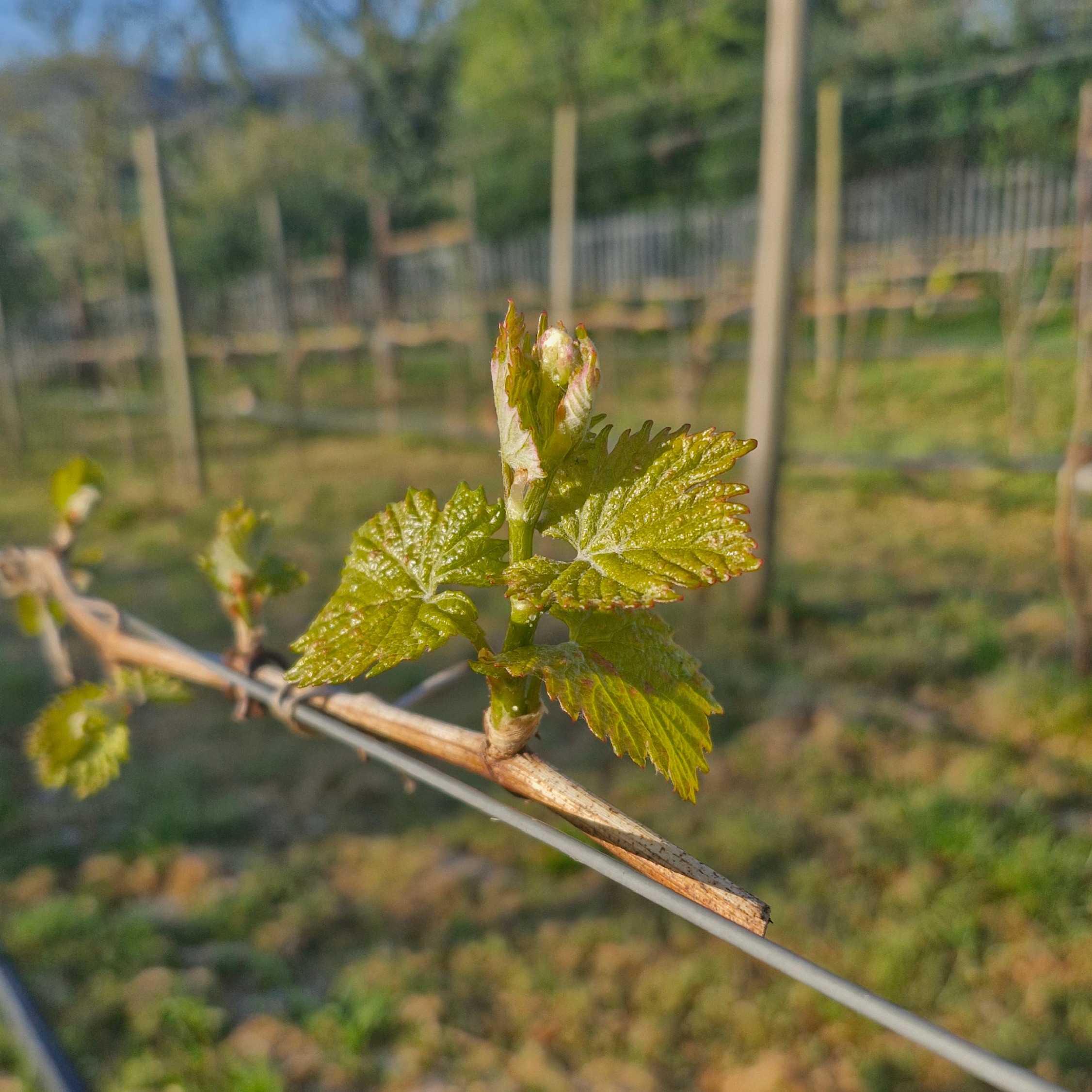 March was a record breaking month for sunshine and the vineyard team were treated to some new helpers in the vineyard in the form of the Infaco tying down machine. Let me explain 'Tying down'! This is the final step in the pruning process and is the action of attaching the fruiting cane to the fruiting wire by bending it from vertical to horizontal and securing it with a biodegradable paper tie. Historically this has been done by hand, and is a time consuming business with over 80,000 canes to restrain. Never short of ingenuity the vineyard team adapted their new found friends into foliage wire clips later in the season to help with canopy management. A worthy investment.